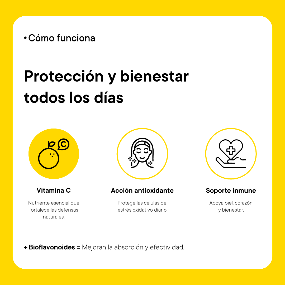 Su fórmula con bioflavonoides potencia la acción antioxidante y mejora la biodisponibilidad, ofreciendo una protección más completa y efectiva para tu día a día.